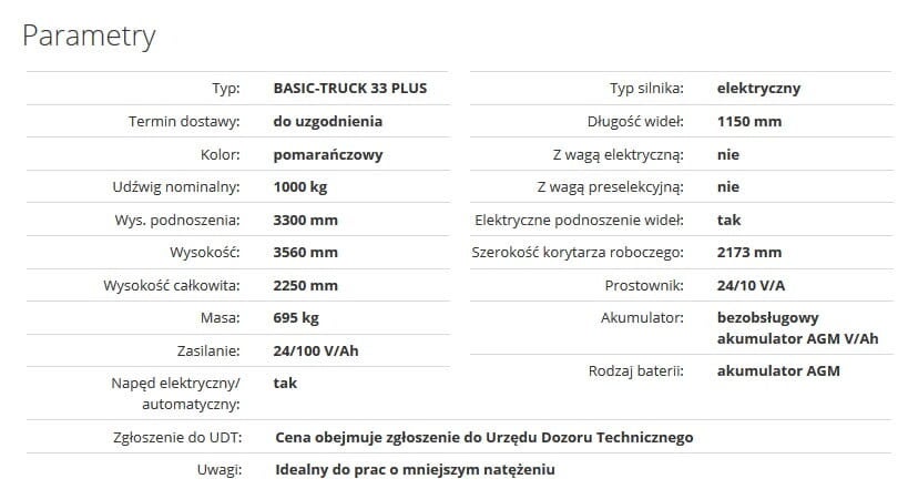 De elektrische heftruck BASIC-TRUCK 33 PLUS is een palletwagen die wordt gebruikt voor laad- en loswerkzaamheden en voor het stapelen van pallets met goederen op stellingen, vooral op plaatsen met minder werkintensiteit.